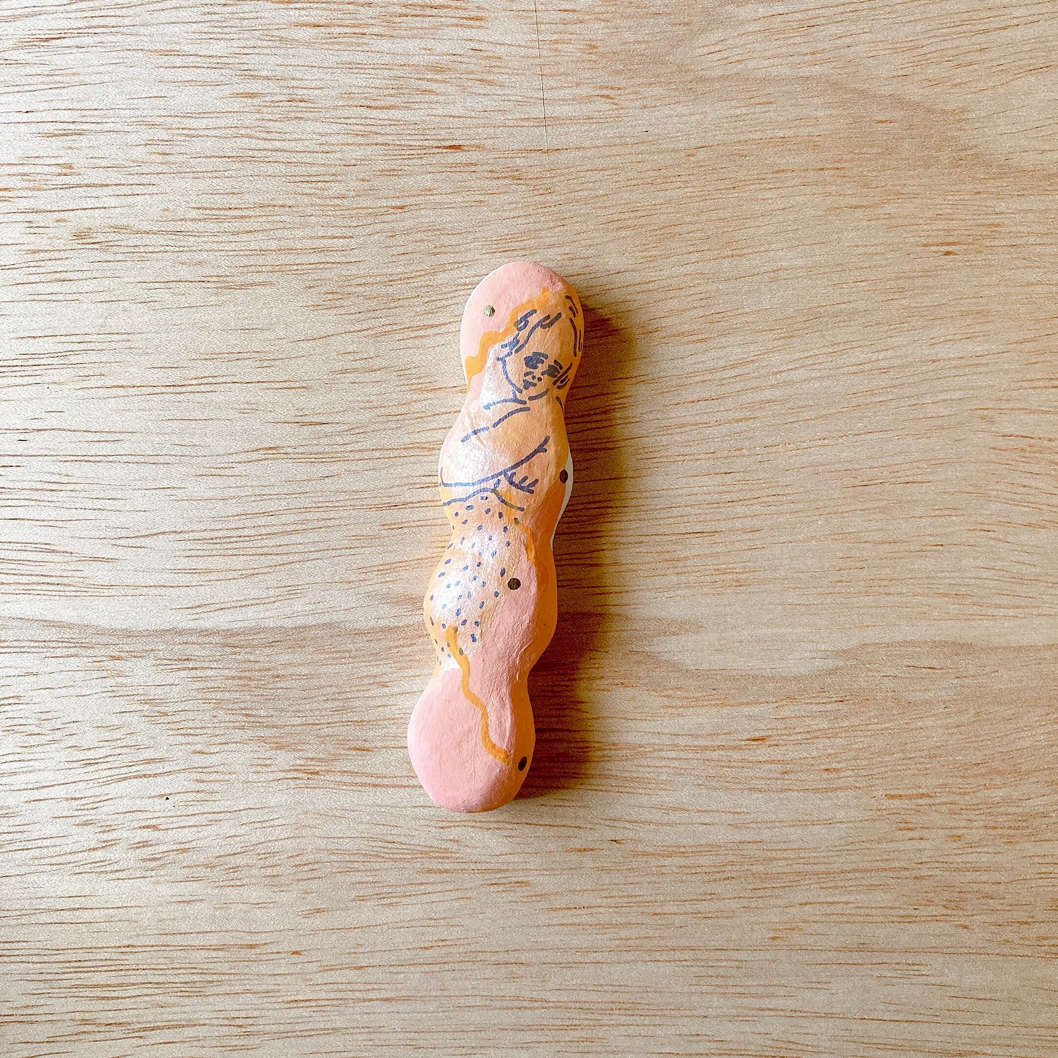 私の生まれた新潟の民芸品と、育った東京の民芸品を今のわたしの表現で描いてみるという試みです。新潟の三角だるまは「七転び八起き」という願いが込められていて、東京の新民芸品としては腸をモチーフにしたもので「腸を健康に保つことで毎日を豊かに過ごせるように」という願いが込められています。ストレスがギュッと詰まった東京では、脳細胞が何億個もある腸を健康に保つことで、精神的にも安定して過ごせるということから、その形にしました。三角だるまの素地は職人さんの手によるもので、そこへ絵付させていただきました。縁起物、民芸品としてみなさんに「よいことがありますように」と願うものとして、作品にしました。