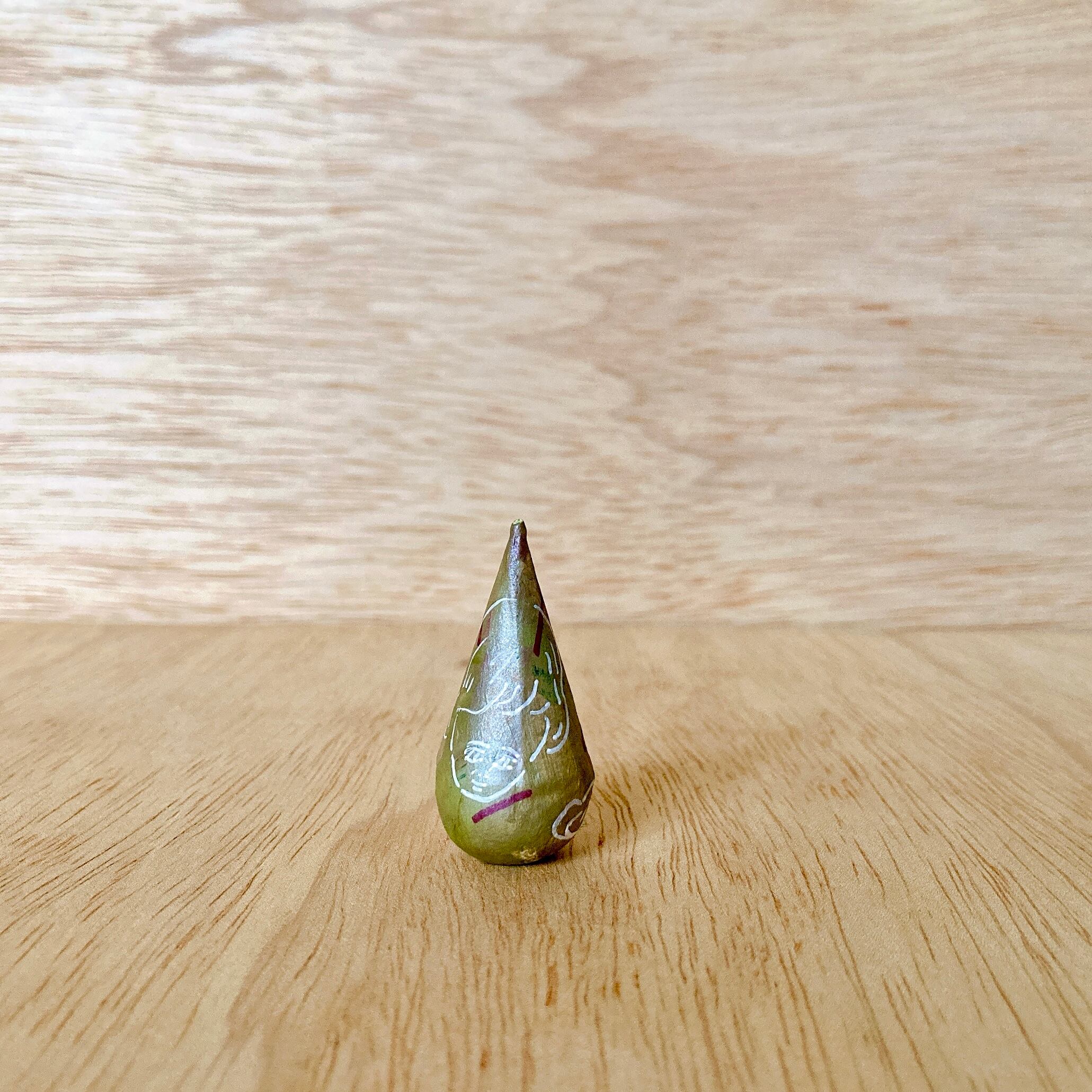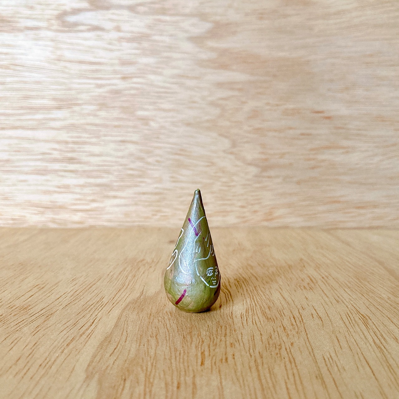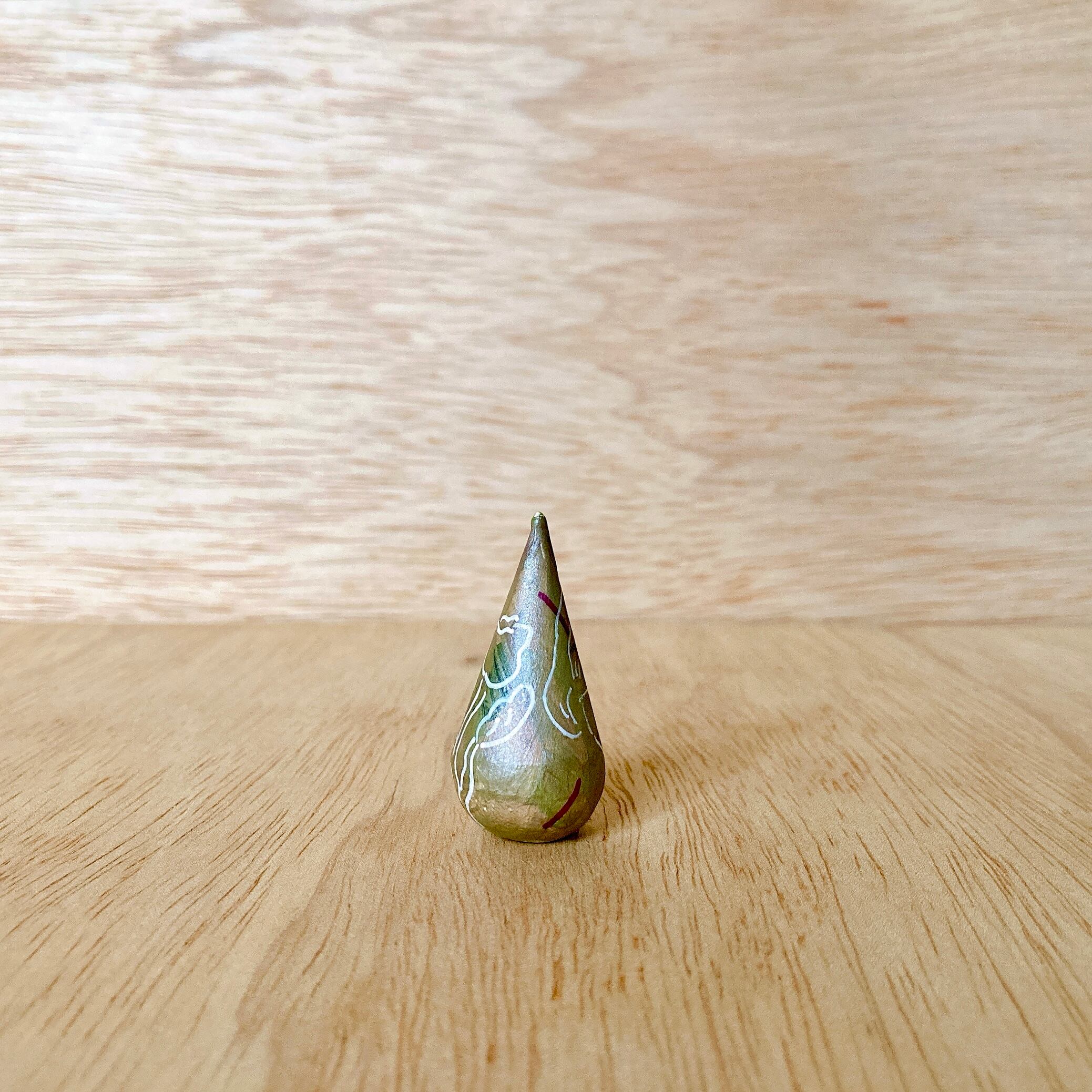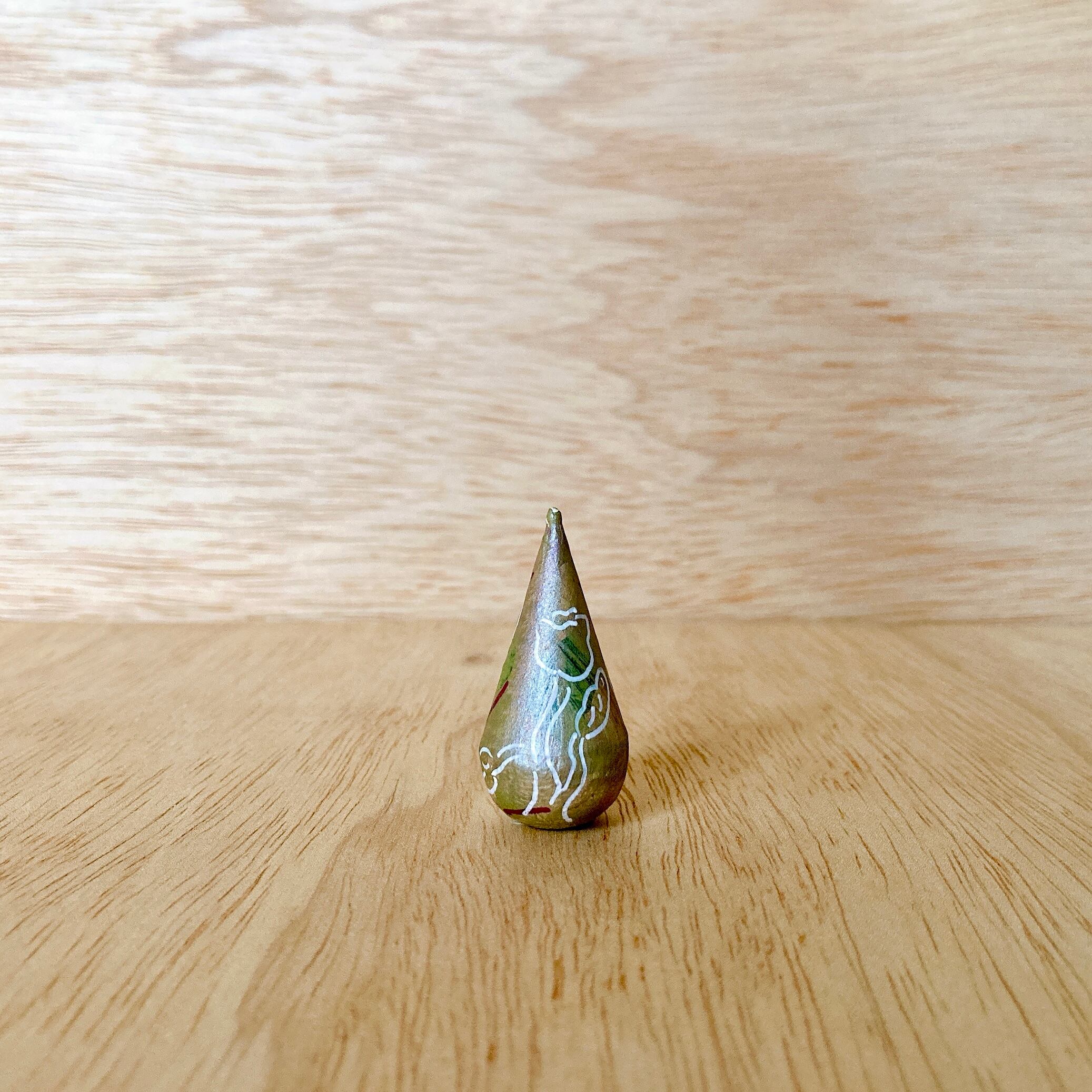 私の生まれた新潟の民芸品と、育った東京の民芸品を今のわたしの表現で描いてみるという試みです。新潟の三角だるまは「七転び八起き」という願いが込められていて、東京の新民芸品としては腸をモチーフにしたもので「腸を健康に保つことで毎日を豊かに過ごせるように」という願いが込められています。ストレスがギュッと詰まった東京では、脳細胞が何億個もある腸を健康に保つことで、精神的にも安定して過ごせるということから、その形にしました。三角だるまの素地は職人さんの手によるもので、そこへ絵付させていただきました。縁起物、民芸品としてみなさんに「よいことがありますように」と願うものとして、作品にしました。