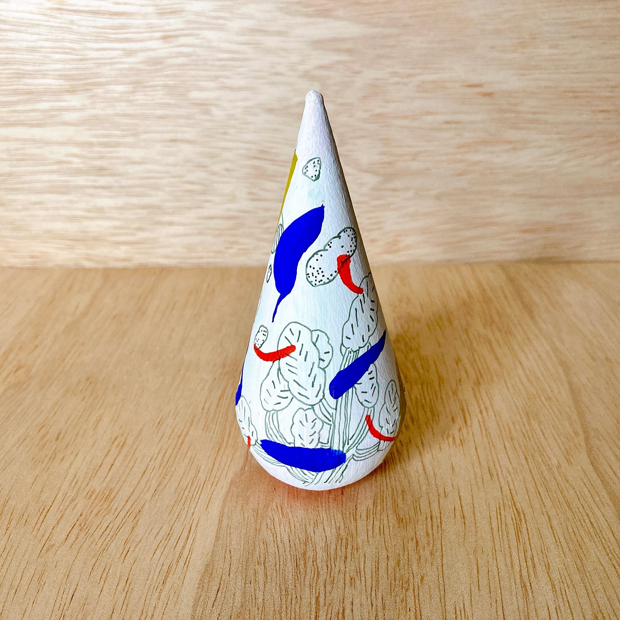 私の生まれた新潟の民芸品と、育った東京の民芸品を今のわたしの表現で描いてみるという試みです。新潟の三角だるまは「七転び八起き」という願いが込められていて、東京の新民芸品としては腸をモチーフにしたもので「腸を健康に保つことで毎日を豊かに過ごせるように」という願いが込められています。ストレスがギュッと詰まった東京では、脳細胞が何億個もある腸を健康に保つことで、精神的にも安定して過ごせるということから、その形にしました。三角だるまの素地は職人さんの手によるもので、そこへ絵付させていただきました。縁起物、民芸品としてみなさんに「よいことがありますように」と願うものとして、作品にしました。