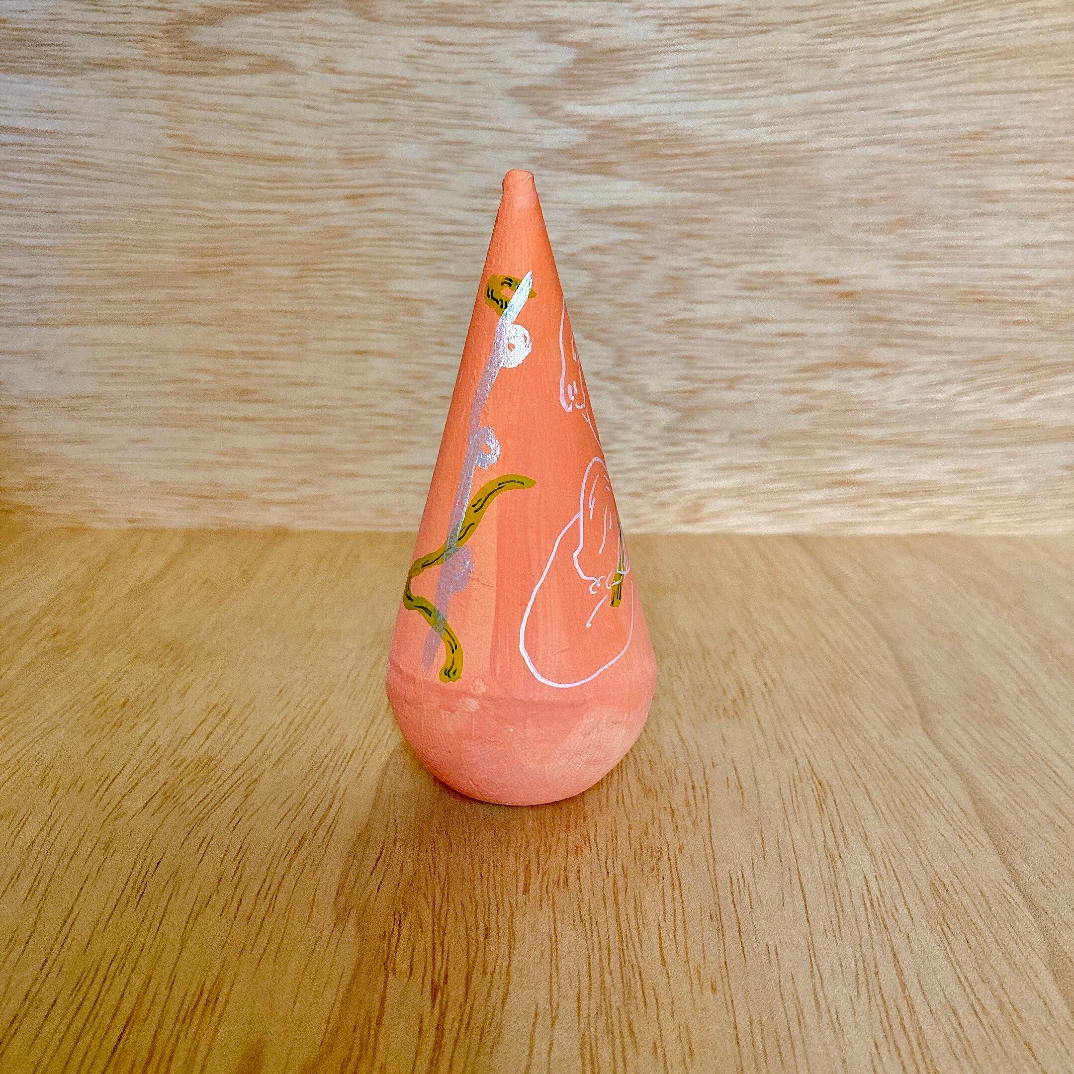 私の生まれた新潟の民芸品と、育った東京の民芸品を今のわたしの表現で描いてみるという試みです。新潟の三角だるまは「七転び八起き」という願いが込められていて、東京の新民芸品としては腸をモチーフにしたもので「腸を健康に保つことで毎日を豊かに過ごせるように」という願いが込められています。ストレスがギュッと詰まった東京では、脳細胞が何億個もある腸を健康に保つことで、精神的にも安定して過ごせるということから、その形にしました。三角だるまの素地は職人さんの手によるもので、そこへ絵付させていただきました。縁起物、民芸品としてみなさんに「よいことがありますように」と願うものとして、作品にしました。