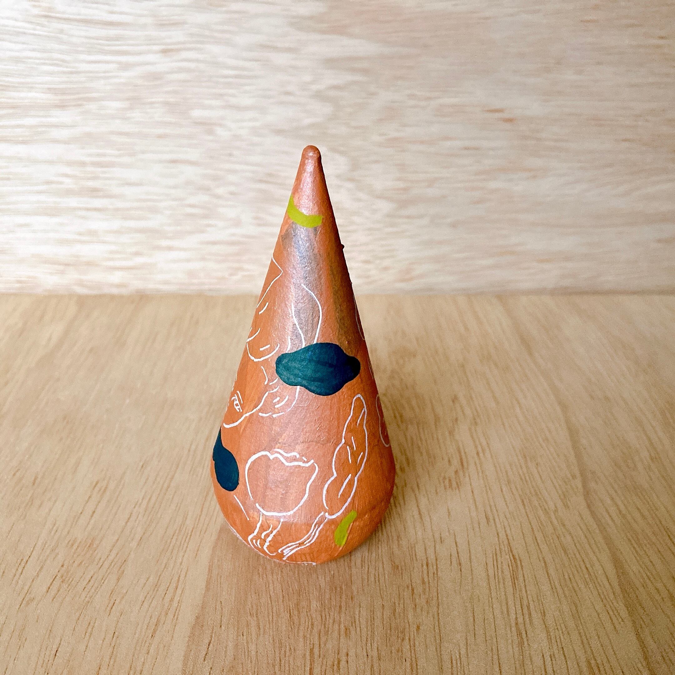 私の生まれた新潟の民芸品と、育った東京の民芸品を今のわたしの表現で描いてみるという試みです。新潟の三角だるまは「七転び八起き」という願いが込められていて、東京の新民芸品としては腸をモチーフにしたもので「腸を健康に保つことで毎日を豊かに過ごせるように」という願いが込められています。ストレスがギュッと詰まった東京では、脳細胞が何億個もある腸を健康に保つことで、精神的にも安定して過ごせるということから、その形にしました。三角だるまの素地は職人さんの手によるもので、そこへ絵付させていただきました。縁起物、民芸品としてみなさんに「よいことがありますように」と願うものとして、作品にしました。
