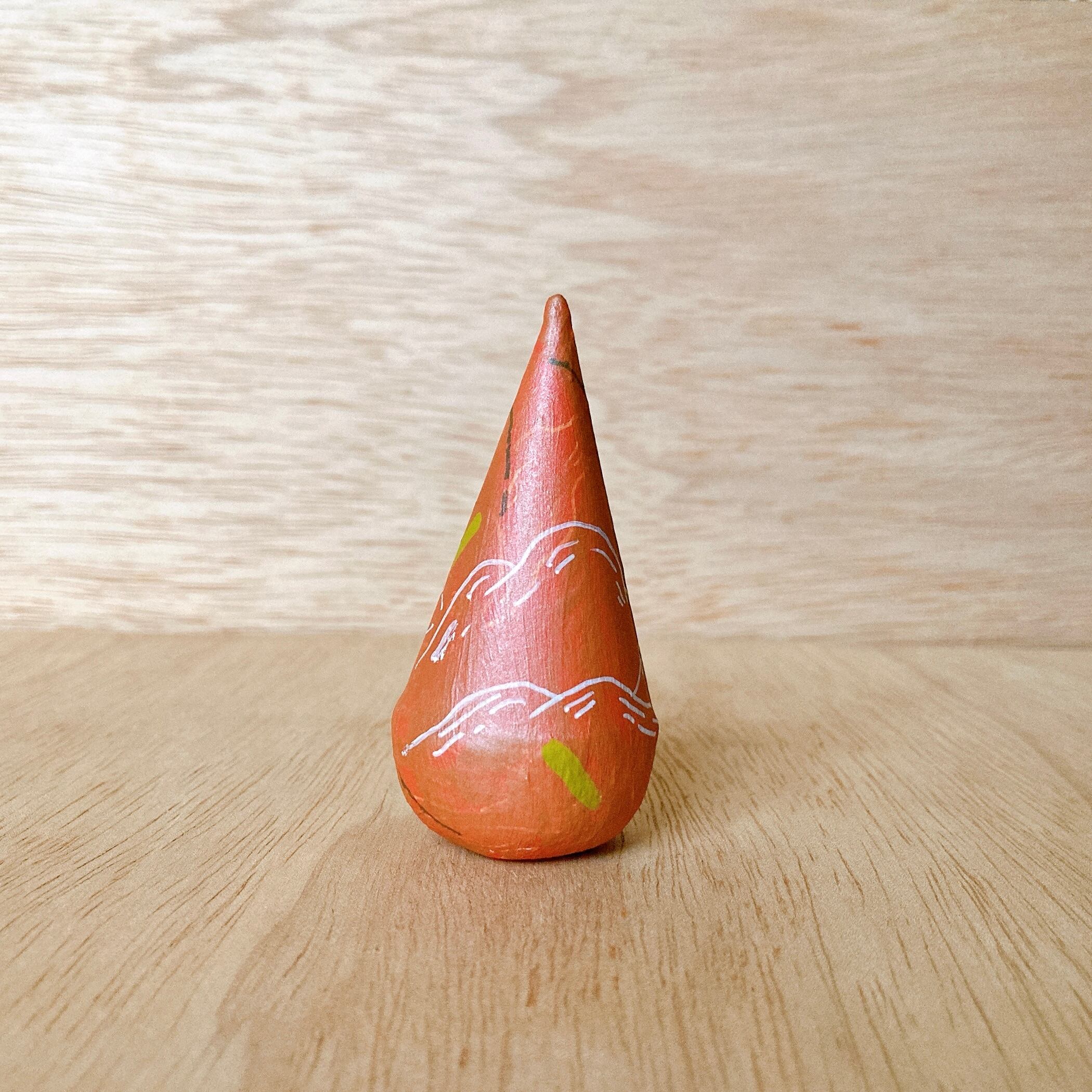 私の生まれた新潟の民芸品と、育った東京の民芸品を今のわたしの表現で描いてみるという試みです。新潟の三角だるまは「七転び八起き」という願いが込められていて、東京の新民芸品としては腸をモチーフにしたもので「腸を健康に保つことで毎日を豊かに過ごせるように」という願いが込められています。ストレスがギュッと詰まった東京では、脳細胞が何億個もある腸を健康に保つことで、精神的にも安定して過ごせるということから、その形にしました。三角だるまの素地は職人さんの手によるもので、そこへ絵付させていただきました。縁起物、民芸品としてみなさんに「よいことがありますように」と願うものとして、作品にしました。