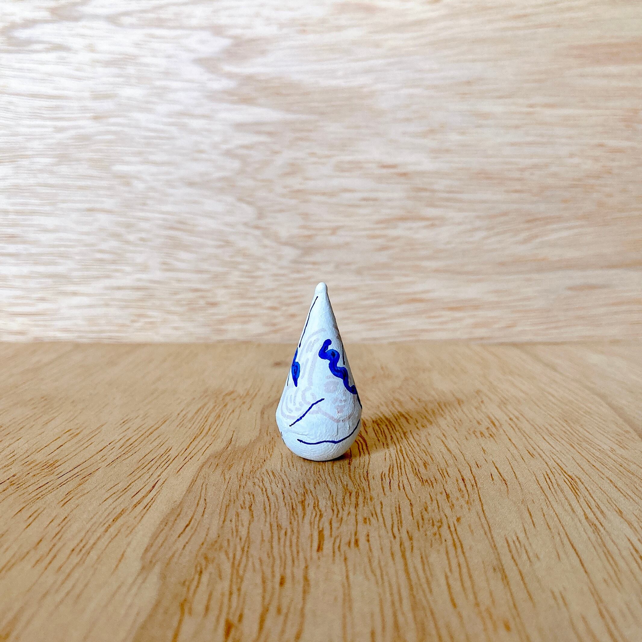 私の生まれた新潟の民芸品と、育った東京の民芸品を今のわたしの表現で描いてみるという試みです。新潟の三角だるまは「七転び八起き」という願いが込められていて、東京の新民芸品としては腸をモチーフにしたもので「腸を健康に保つことで毎日を豊かに過ごせるように」という願いが込められています。ストレスがギュッと詰まった東京では、脳細胞が何億個もある腸を健康に保つことで、精神的にも安定して過ごせるということから、その形にしました。三角だるまの素地は職人さんの手によるもので、そこへ絵付させていただきました。縁起物、民芸品としてみなさんに「よいことがありますように」と願うものとして、作品にしました。